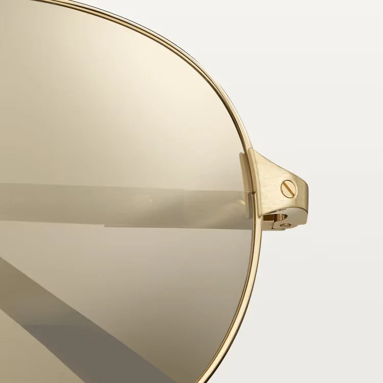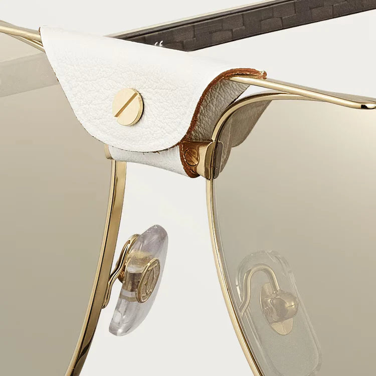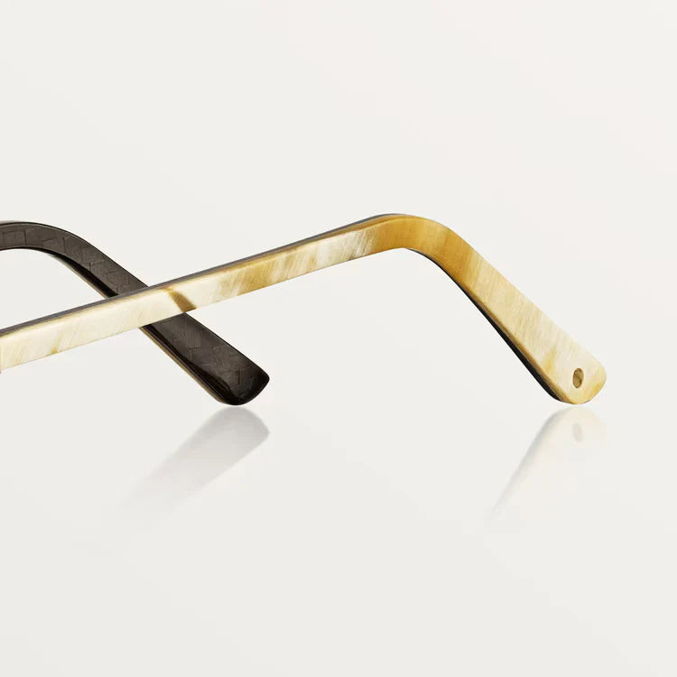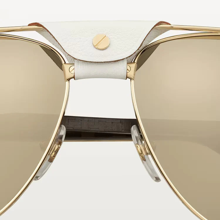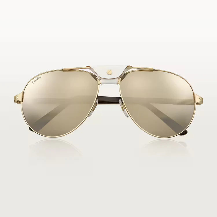 Santos de ca sunglasses, white horn and carbon temples, champagne golden-finish metal, white leather bridge, pilot shape, lenses with a golden flash, class 3 solar protection. Dimensions: lenses 61 mm, bridge 16 mm, temples 140 mm.